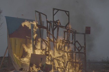The act of destruction becomes a visceral response to the impossibility of creating images with greater urgency or ethical weight than those emerging from Gaza’s harrowing reality. Flames consuming canvases dominate the screen, transforming the medium of painting into ash and silence.