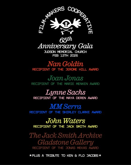 We will honor Nan Goldin, Joan Jonas, Lynne Sachs, MM Serra, John Waters, and the Jack Smith Archive at Gladstone Gallery, and pay tribute to Ken and Flo Jacobs.